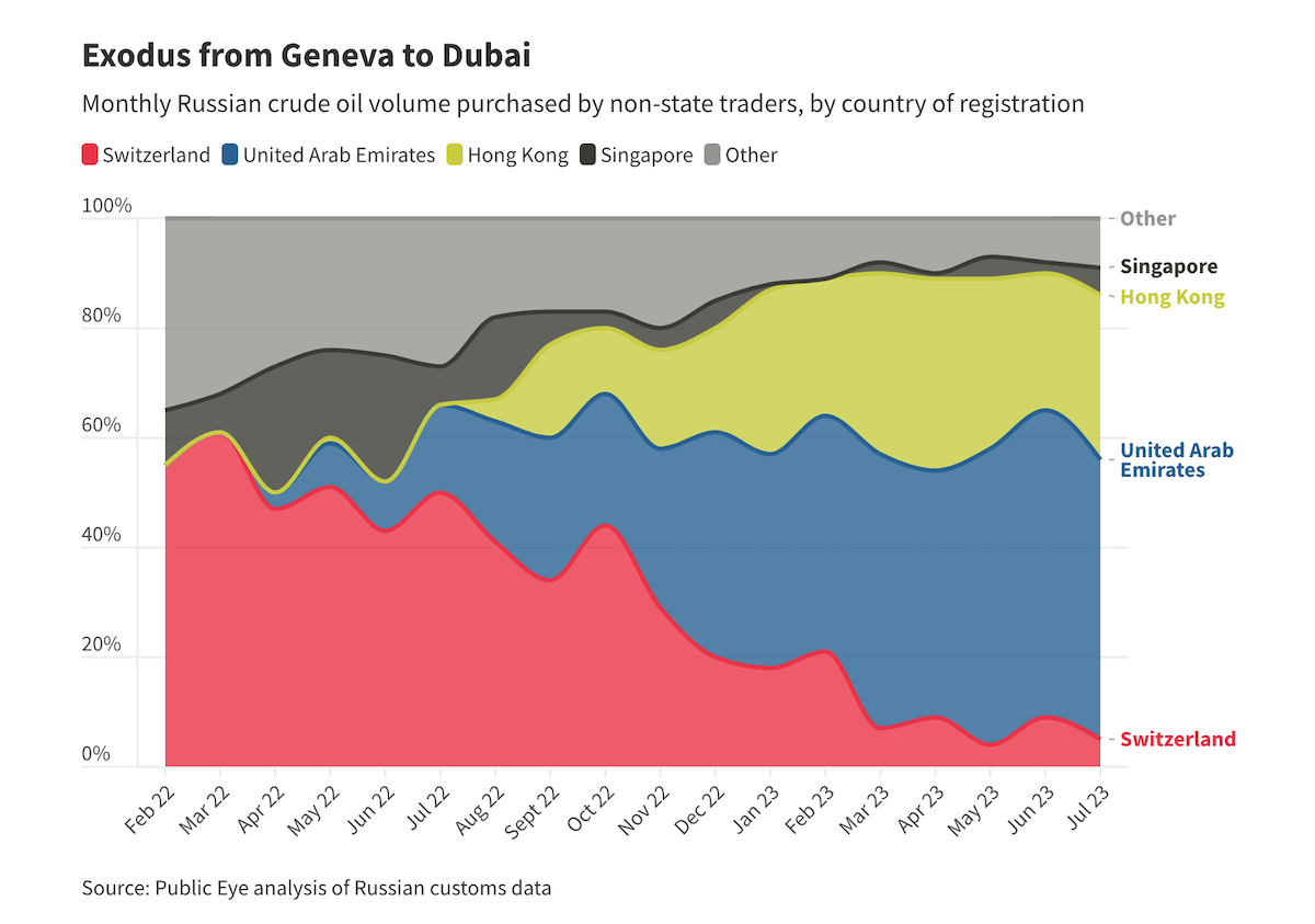 Швейцарские гиганты Trafigura, Vitol и Gunvor больше не входят в десятку крупнейших покупателей российской нефти. Однако Public Eye опасается того, что некоторые трейдеры будут использовать Дубай для ведения бизнеса, запрещенного в Конфедерации: швейцарское законодательство об эмбарго не содержит четкого определения территориального охвата санкций. Обеспокоенность экспертов вызывает и то, что на смену крупным предприятиям пришли малоизвестные торговые компании, работающие с огромными объемами. По информации Tribune de Genève, Вашингтон, опасаясь того, что целый сектор торговли нефтью находится в руках совершенно непрозрачных посредников, даже призывал женевские компании возобновить участие в легальной стороне торговли российской нефтью.