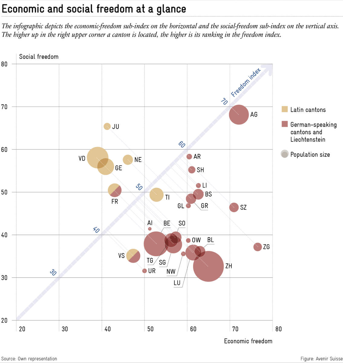 Каждый год аналитический центр Avenir Suisse измеряет экономические и социальные свободы в кантонах Швейцарии по трем десяткам показателей. Учитываются самые разные индикаторы – от налоговой нагрузки, правил продажи алкоголя и часов работы магазинов до видеонаблюдения, свободы выбора школы, политических прав иностранцев и срока получения разрешения на строительство. Индекс Avenir Suisse основан на концепции негативной свободы, т.е. на свободе личности от внешних ограничений. В политической философии негативная свобода не означает что-то плохое, а используется как противопоставление позитивной свободе, которая понимается как свобода что-то делать. Негативная же свобода определяется через права личности на защиту от внешнего принуждения. Как подчеркивают авторы рейтинга, в обществе, организованном по негативным критериям свободы, правила в первую очередь служат для гарантии свободы индивидуумов. Исследование не позволяет оценить, насколько люди пользуются своими правами на свободу, но помогает сравнить, сколько свобод предоставляют своим жителям разные кантоны.
