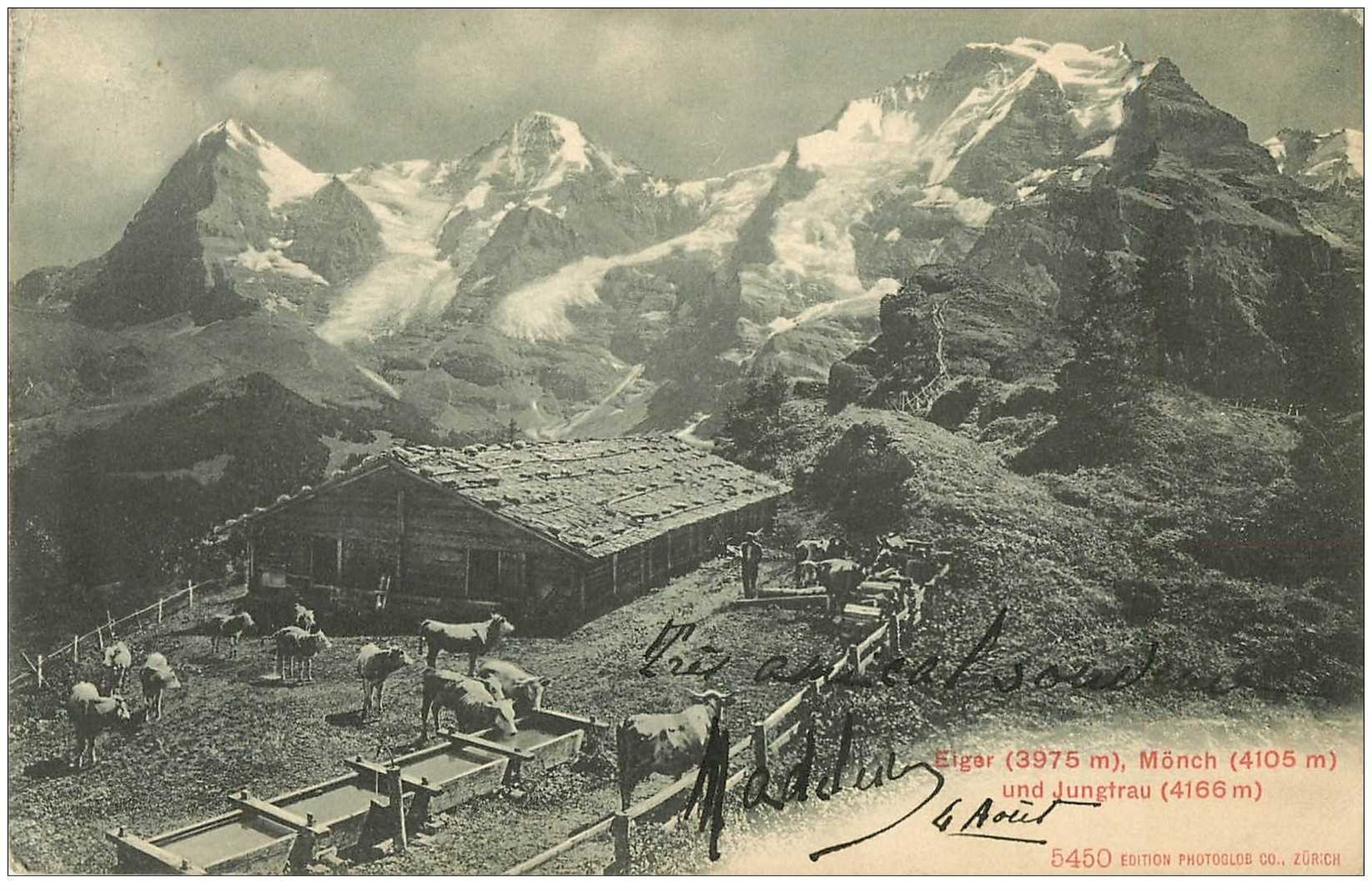 здавна путешествующие по Швейцарии стремились полюбоваться горами Эйгер, Мёнх и Юнгфрау. Фотография 1907 года.