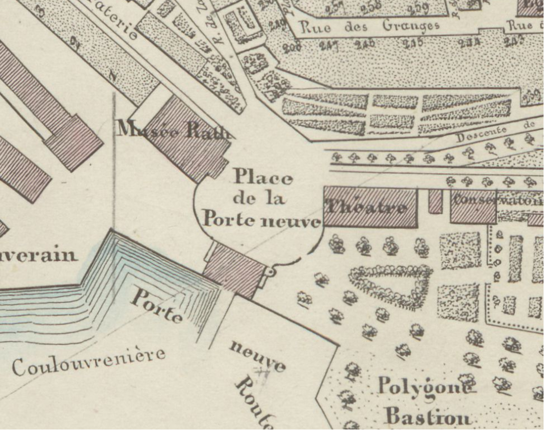 Сохранившиеся карты Бриге 1853-1854 годов (момент разрушения ворот) и 1863 года подтверждают наличие перехода от place de la porte de Neuve к сокращенному названию place Neuve, скорее чем к place de Neuve. Однако среди жителей, как это часто бывает, еще долго бытовало название porte de Neuve, как мы видим на гравюре Огюста Магнена конца 19 века. При этом заметка в женевской газете Journal de Genève за 1879 год, рассказывая о том, как обвалилась крыша павильона, где играл оркестр, упоминает, что произошло это пренеприятное происшествие поблизости от рlace de Neuve.