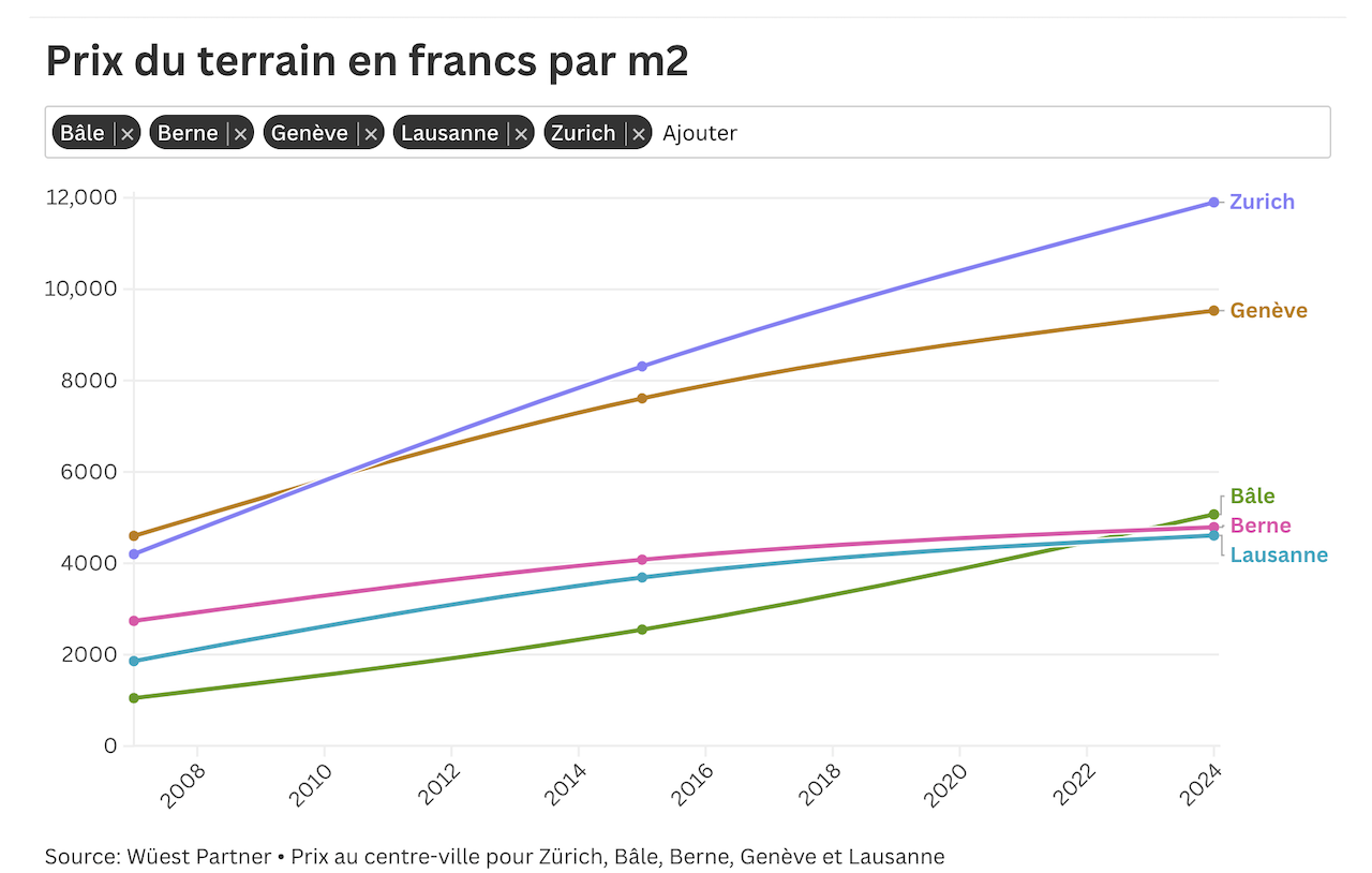 Цена за кв. м в центре Цюриха, Базеля, Берна, Женевы и Лозанны. Источник: Wüest Partner