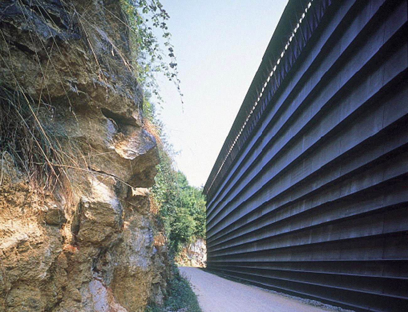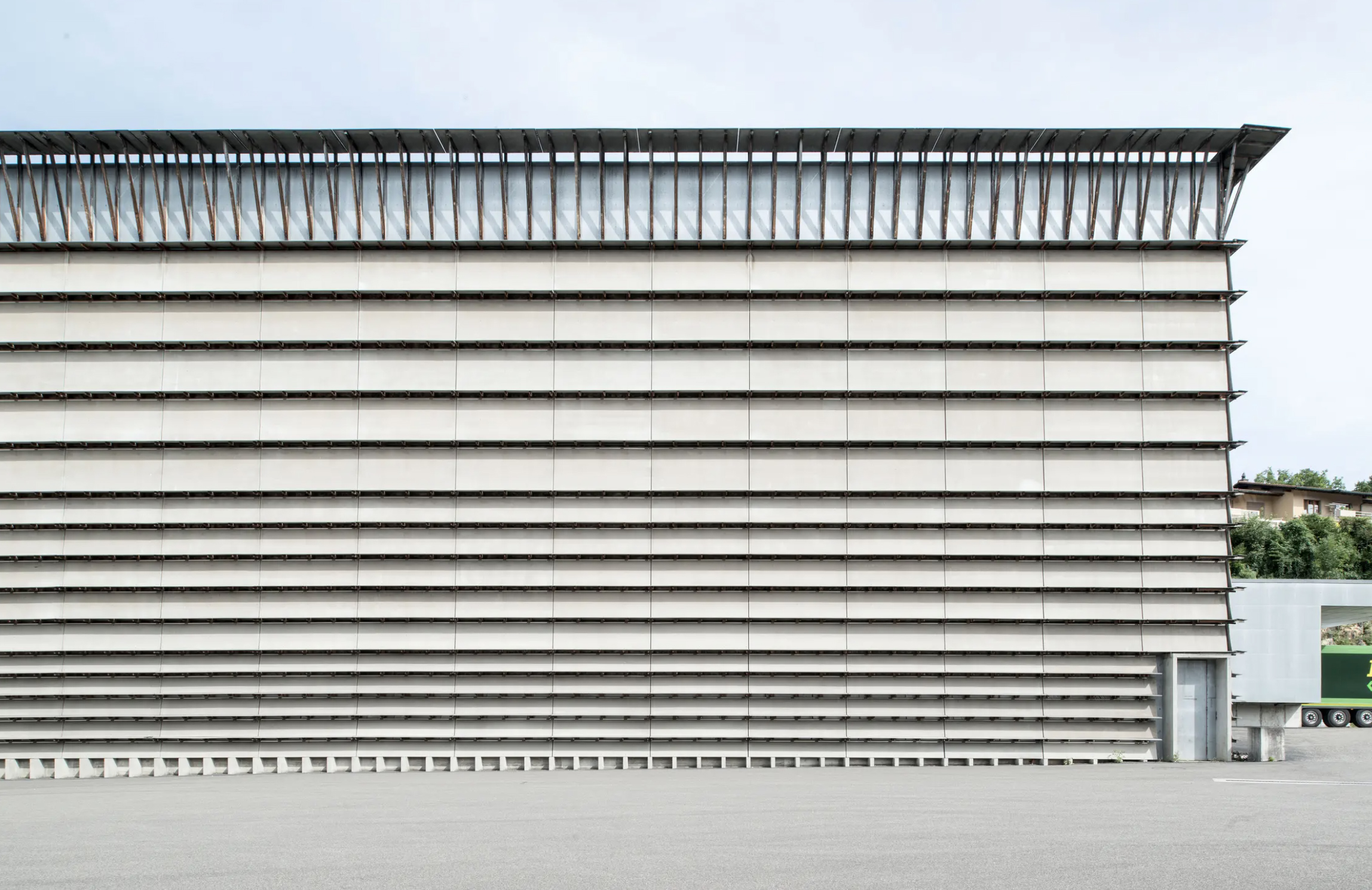 Находя источник вдохновения в процессе складирования как таковом, архитекторы отсылают и к традиционному методу хранения распиленных досок штабелями на многочисленных лесопильных заводах района, и к слоям известняка в карьере, в котором расположено здание склада.