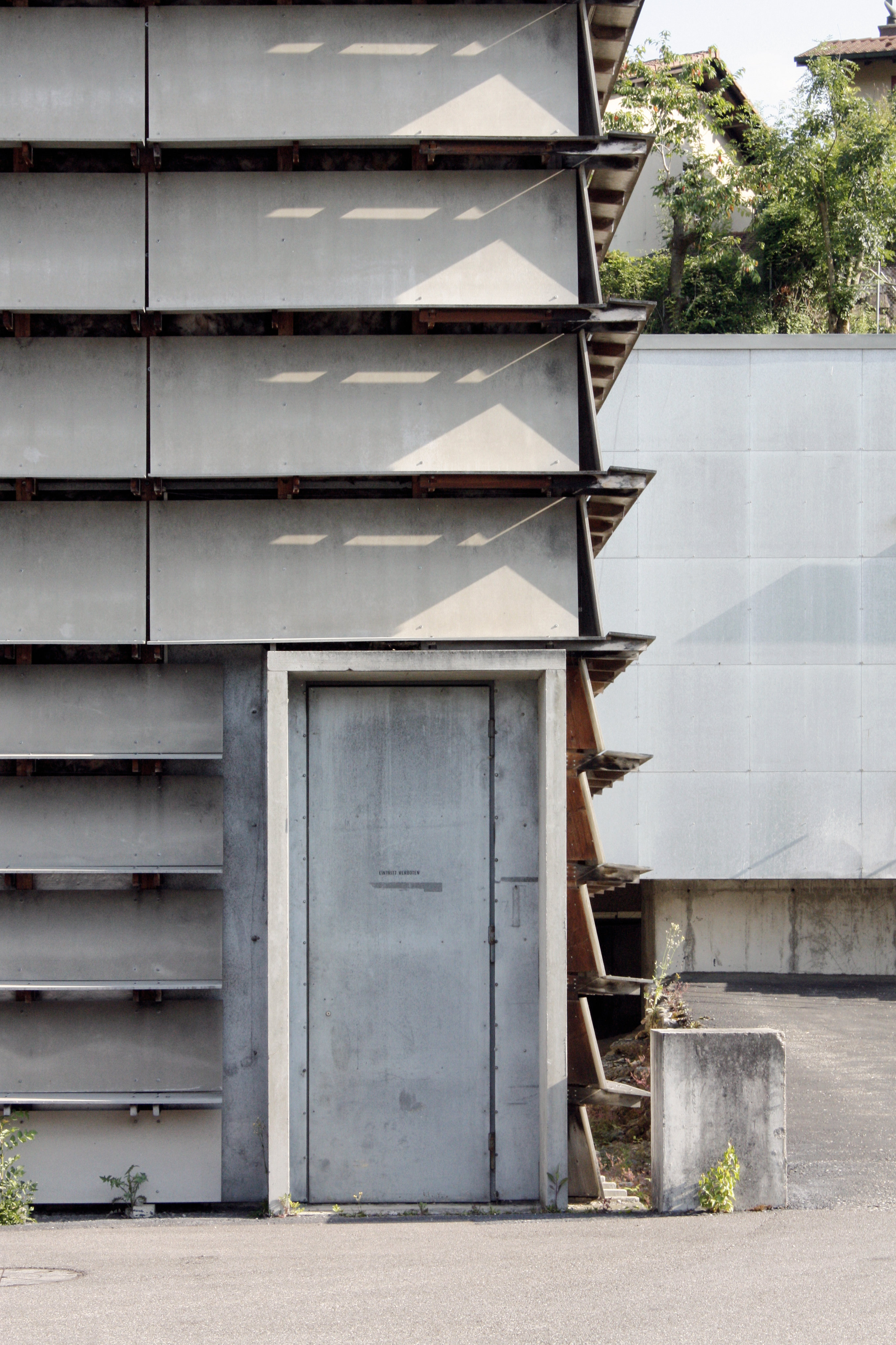 Слои конструкции оставлены видимыми, и от этого возникает образ штабеля досок; каждый элемент облицовки – это своего рода каркас склада, в котором «хранятся» части фасада, как и товары внутри здания. Асбестовые панели, более крупные в верхней части, чем в нижней, составляют облицовку и подчеркивают разницу между нижней частью, где многочисленные отдельные фундаменты поддерживают фасадную конструкцию, и верхней, где консольная деревянная конструкция открывает оцинкованный металлический короб внутри здания.