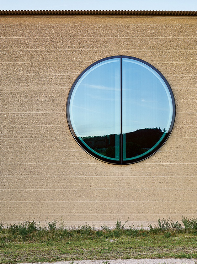 Швы между блоками земли сделаны из бетона, чтобы предотвратить «вымывание» стены дождями, а фасады прорезаны гигантскими круглыми окнами, создающими яркий контраст между архаичностью стен и инновационностью материала остекления.