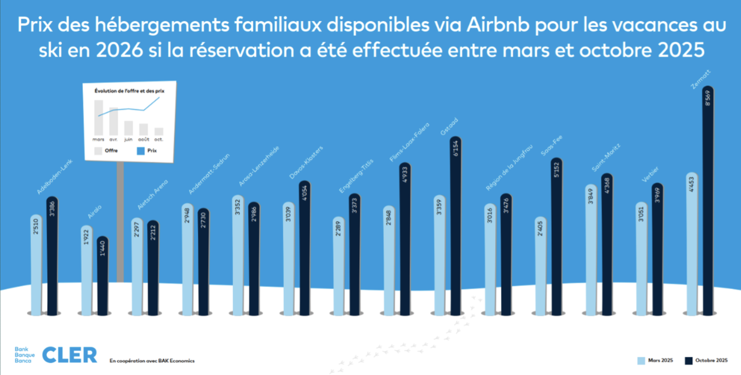 Каждый год Bank Cler на основе данных исследовательского института BAK Economics рассчитывает стоимость недельного отдыха на четырнадцати различных горнолыжных курортах Швейцарии. После рекордных показателей прошлой зимы специалисты вновь ожидают сильного сезона. Швейцарские курорты остаются популярными, спрос на жилье не утихает, а вместе с этим растут и цены – стоимость катания на лыжах в среднем выросла на 6%.