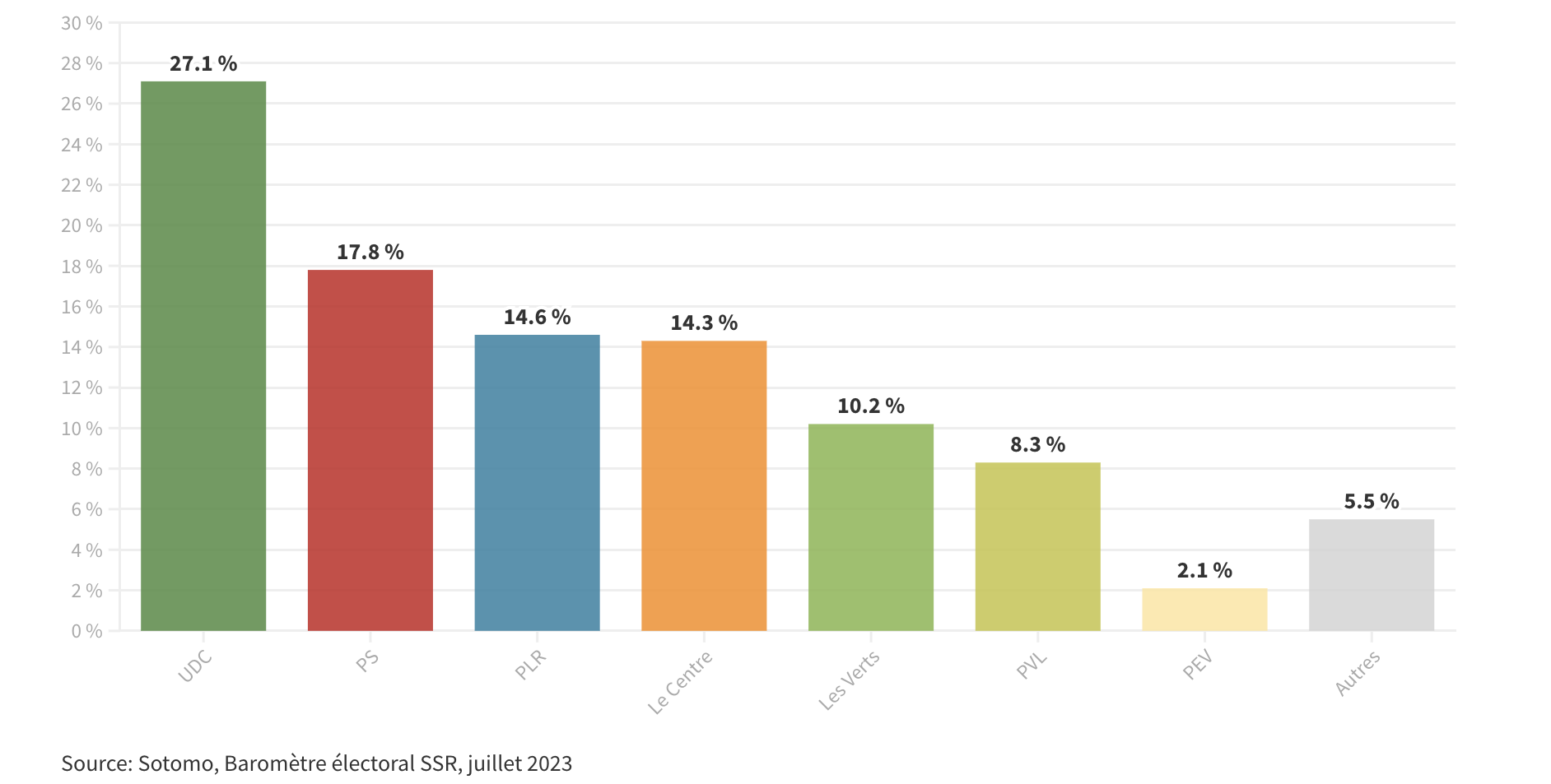 Согласно опросу общественного мнения, проведенному с 8 по 22 июня институтом Sotomo, если бы выборы состоялись в конце июня, то на первом месте оказалась бы Народная партия Швейцарии (за нее готовы отдать голоса 27.1% избирателей), а на последнем – Евангелическая партия (2.1%). Социалистическая партия заняла бы второе место, но с большим отрывом от НПШ (17.8%), а Зеленые едва перевалили бы за 10-процентный порог. Иными словами, налицо прогресс НПШ и Социалистической партии и регресс экологов, что может удивить, учитывая приоритетность проблемы климатических изменений и уверенность в своих силах лидера Партии Зеленых Бальтазара Глёттли, в начале года заявлявшего о намерении бороться за третье место. Сейчас за почетное третье место борется Либерально-республиканская партия: на сегодняшний день ей готовы отдать свои голоса 14.6% избирателей.