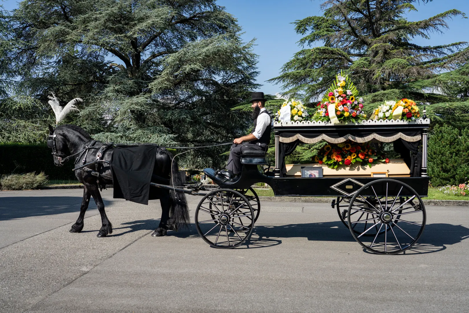 Эта услуга, предоставляемая по запросу и стоящая 775 швейцарских франков, перевозит гроб или урну с покойным из часовни к месту захоронения. В настоящее время эта услуга предоставляется только на кладбище Сен-Жорж – где похоронена, напомним, Сонечка Достоевская – и, как ожидается, будет работать в любую погоду, за исключением случаев «экстремальных погодных условий». Лошадь выбирается из табуна.
