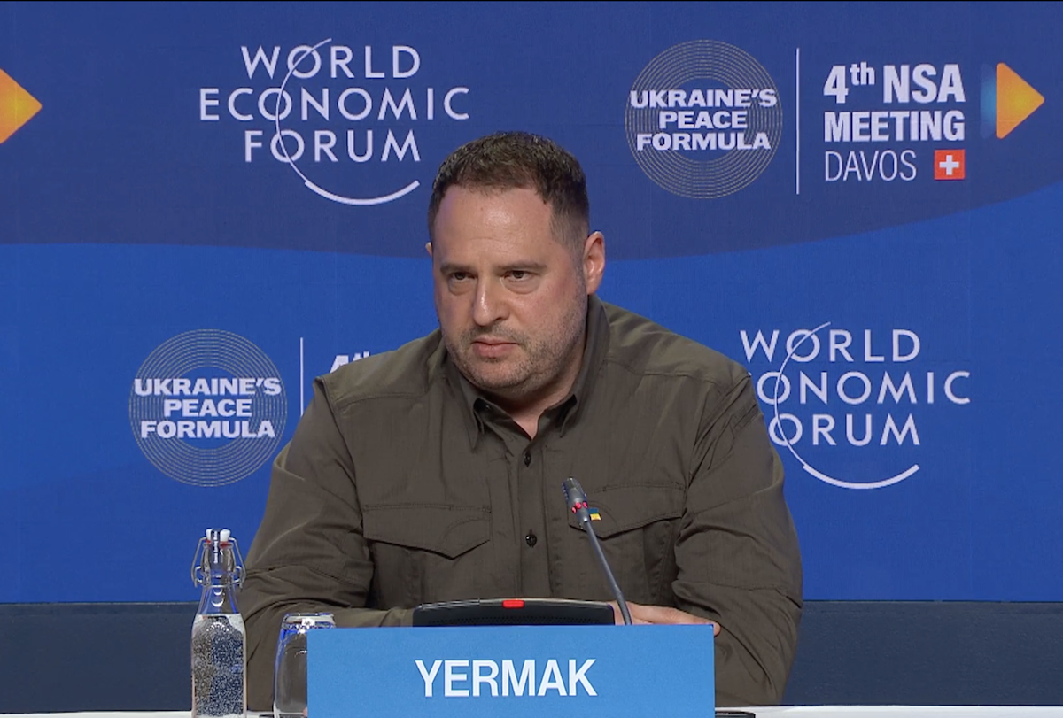 Глава администрации президента Украины Андрей Ермак на пресс-конференции, посвященной итогам встречи по украинской «формуле мира». Скриншот трансляции на сайте weforum.org