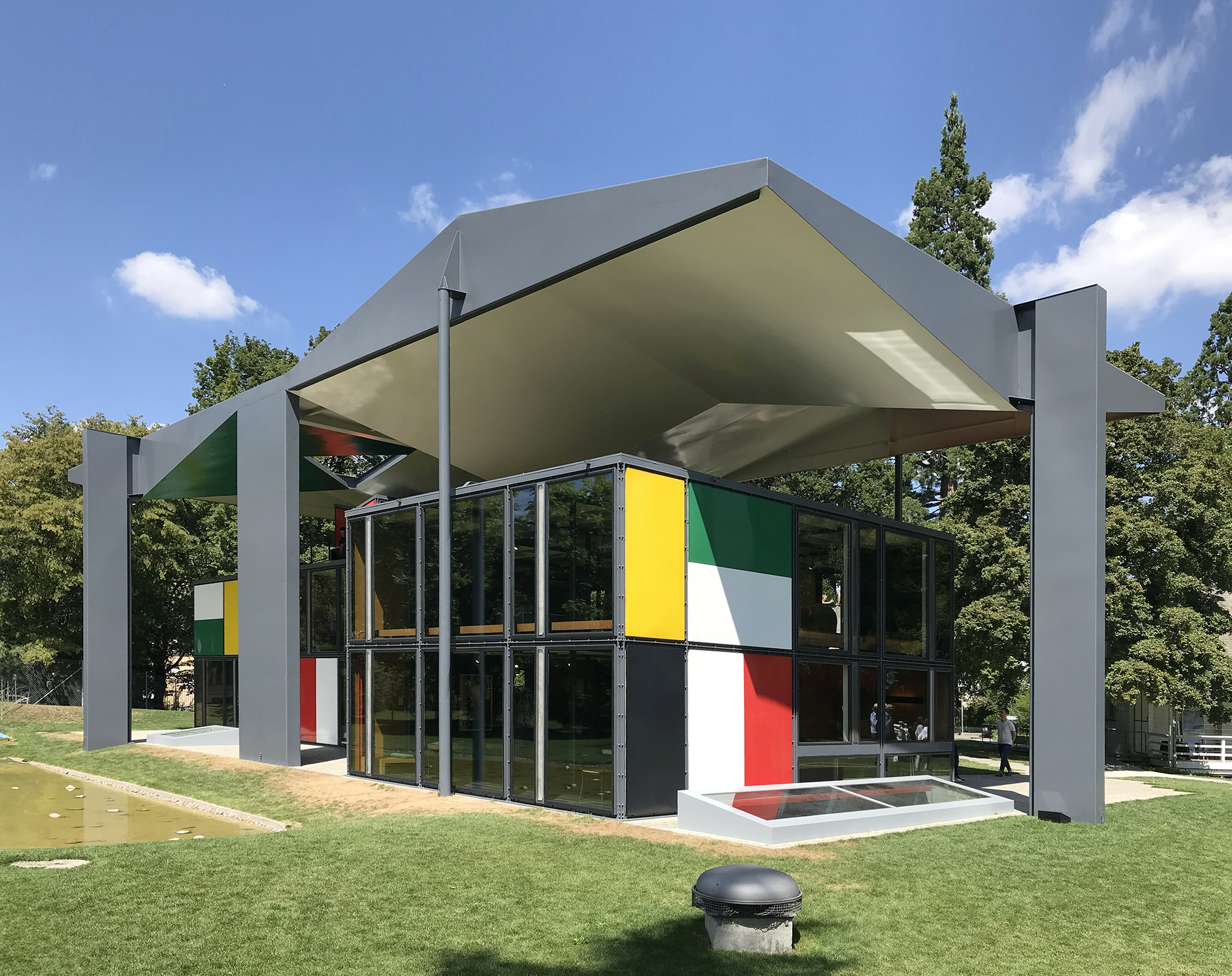 Но вернёмся к проекту в Цюрихе. Ле Корбюзье, мастер бетона, прибегнул на этот раз – он же и единственный! - к несвойственным для себя материалам: стеклу и стали. Архитектор говорил, что хочет создать «самое экспериментальное» своё здание, и это действительно получилось. Павильон сделан полностью сборно-разборным, для строительства было использовано более 20 000 болтов. Это очень современное, экологичное и экономичное решение, отвечающее так называемому принципу «design for disassembly», то есть проектирование для последующей разборки. Архитектор совершенно деконструирует традиционную форму и структуру дома: крыша начисто оторвана от основного объёма интерьера, а колоссальные несущие пилоны построены так, чтобы создавалось ощущение, что крыша не покоится на них, а едва касается. Здание построено на базе «модулора» – системы пропорционирования, основанной на пропорциях человеческого тела, которую изобрёл Ле Корбюзье. Пологий пандус, завершающийся террасой на крыше, подчеркивает концепцию «архитектурного променада» – другую важную тему для автора. В интерьерах архитектор использует разработанную им яркую и разнообразную колористическую систему, что, в сочетании с дизайнерской мебелью и арт-объектами, превращает пространство в так называемый «синтез искусств».